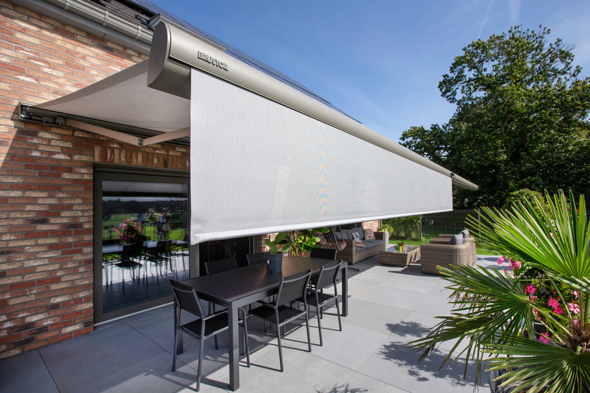 With a projection of up to 4 meters, the Brustor B35 folding arm awning is ideal for large patios. The innovative design of the Brustor B38 awning with valance is perfect for southwest-facing homes.