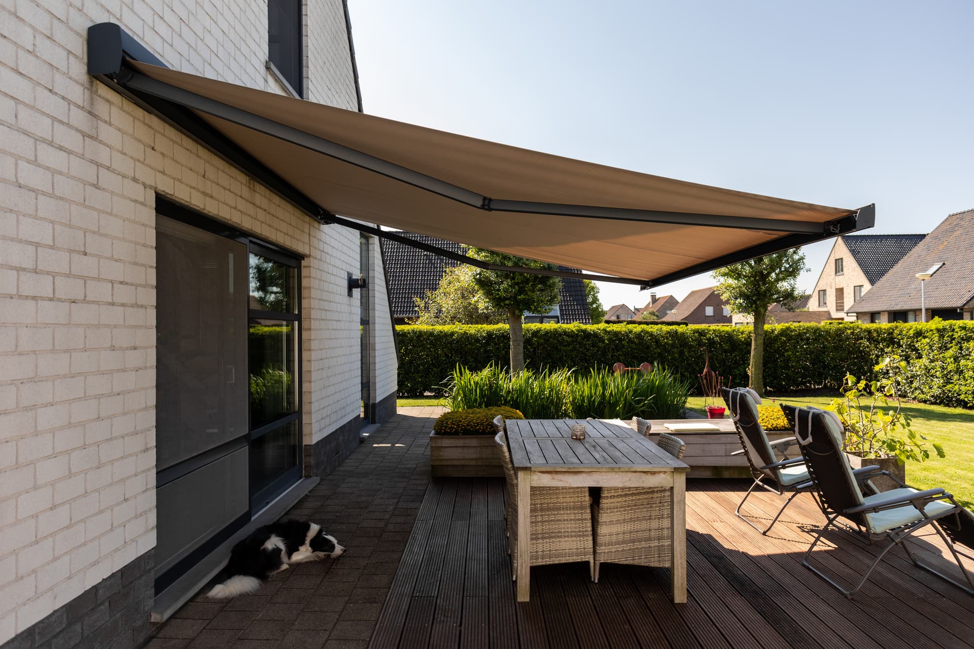 Large retractable awning providing shade over a spacious outdoor dining terrace beside a classic home with wide sliding glass doors