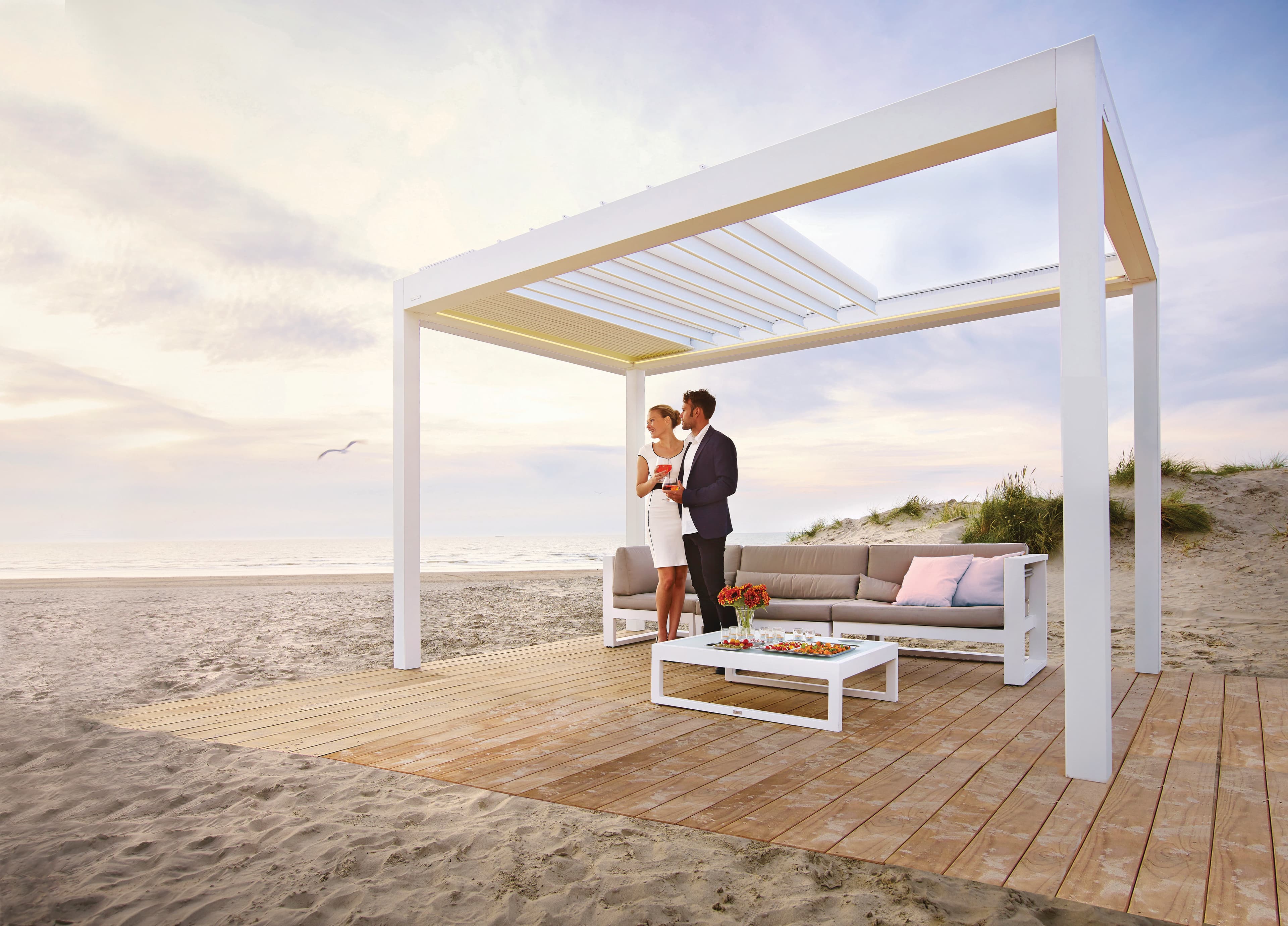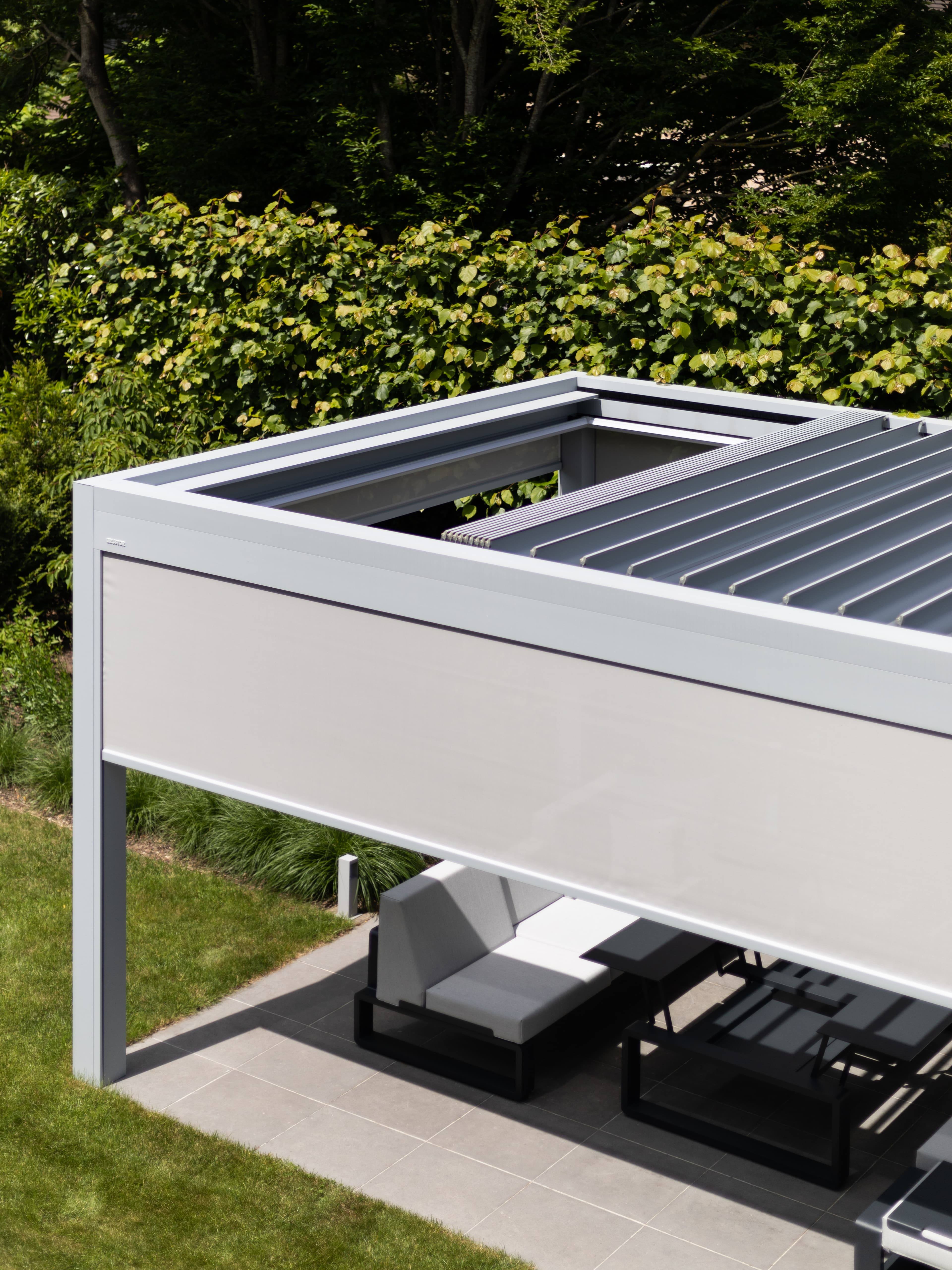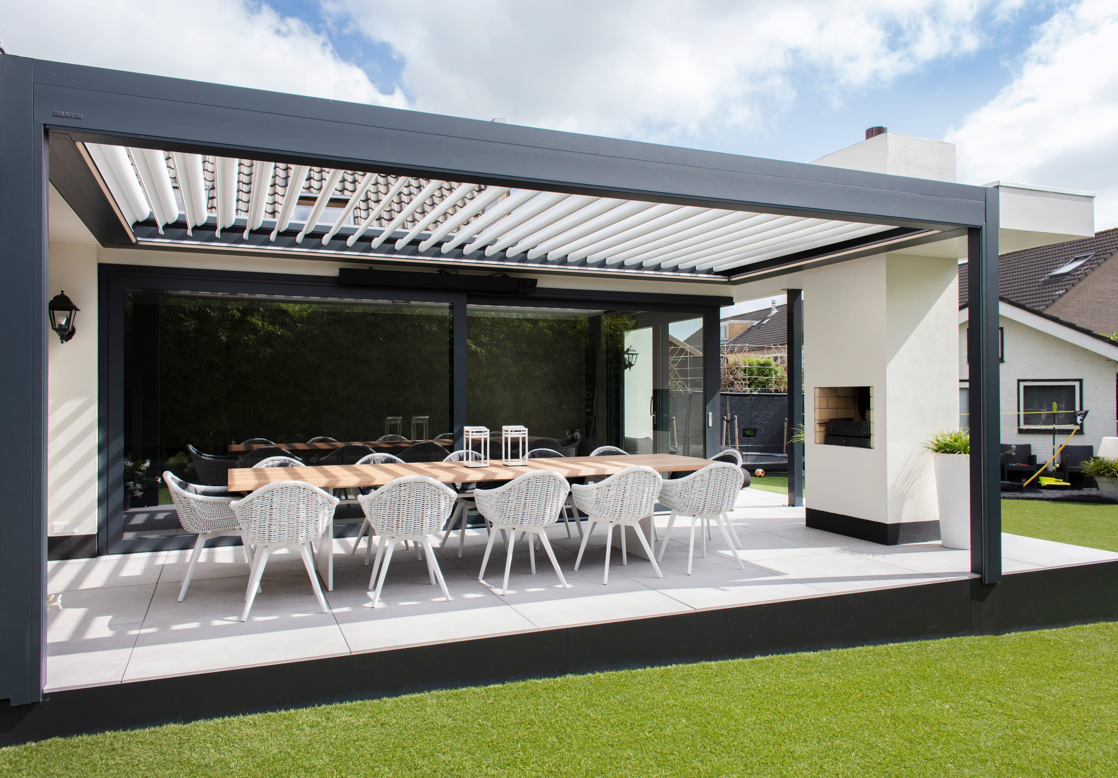 De B600 S terrasoverkapping met schuifdak heeft geïntegreerde screens waardoor het design nog strakker is dan voorheen. Daarnaast zorgt de bediening via de Brustor Connect App voor een groot gebruiksgemak.